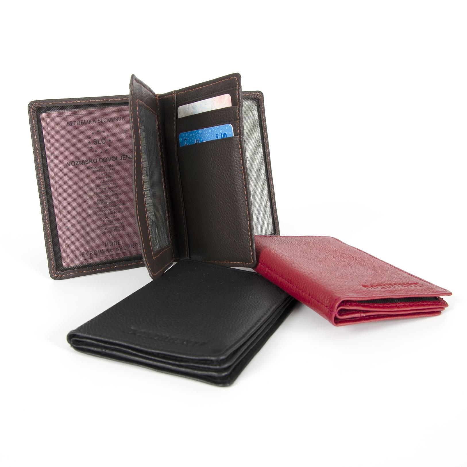Etui za dokumente in kartice iz mehkega govejega usnja je na voljo v črni, rjavi in rdeči barvi. Ima 8 predalčkov – 4 v velikosti kartice in 4 v velikosti prometnega dovoljenja.