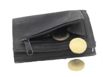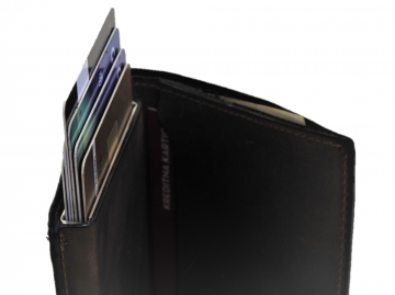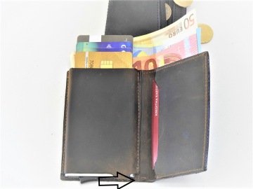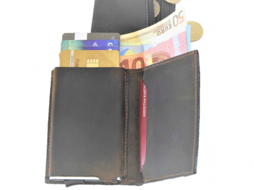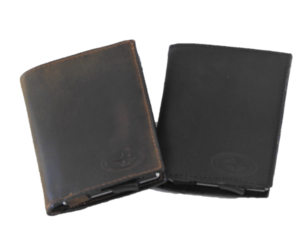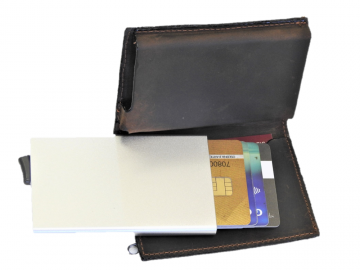 Mala moška usnjena denarnica dimenzije 7,5 x10,5 x 2 cm ima vstavljen aluminijast etuij za 6 kartic, kateri ščiti kartice pred poškodbo in hkrati ima RFID zaščito, katera ščiti proti kraji denarja iz brezstičnih kartic.Kartice s pomočjo posebnega patentiranega mehanizma pridejo same ven iz etuija, tako, da gumb na spodnji strani etuija podrsate proti sredini.Poleg tega v dodatni žep lahko shranite še 6 kartic. Denarnica ima tudi predal za papirnat denar in na zadnji strani žep na zadrgo za drobiž.Narejena je iz kvalitetnega usnja,ki je zelo trpežno.