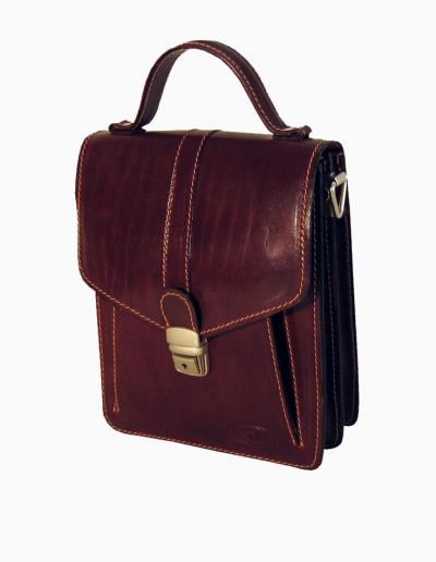 Mala moška torba. Notranjost - 2 lepo dodelana predala + sredinski predal z zadrgo, prostor za mobitel in kartice; Zunanjost - na hrbtni strani predal z zadrgo, pod pokrovom predalček + pas za čez ramo.