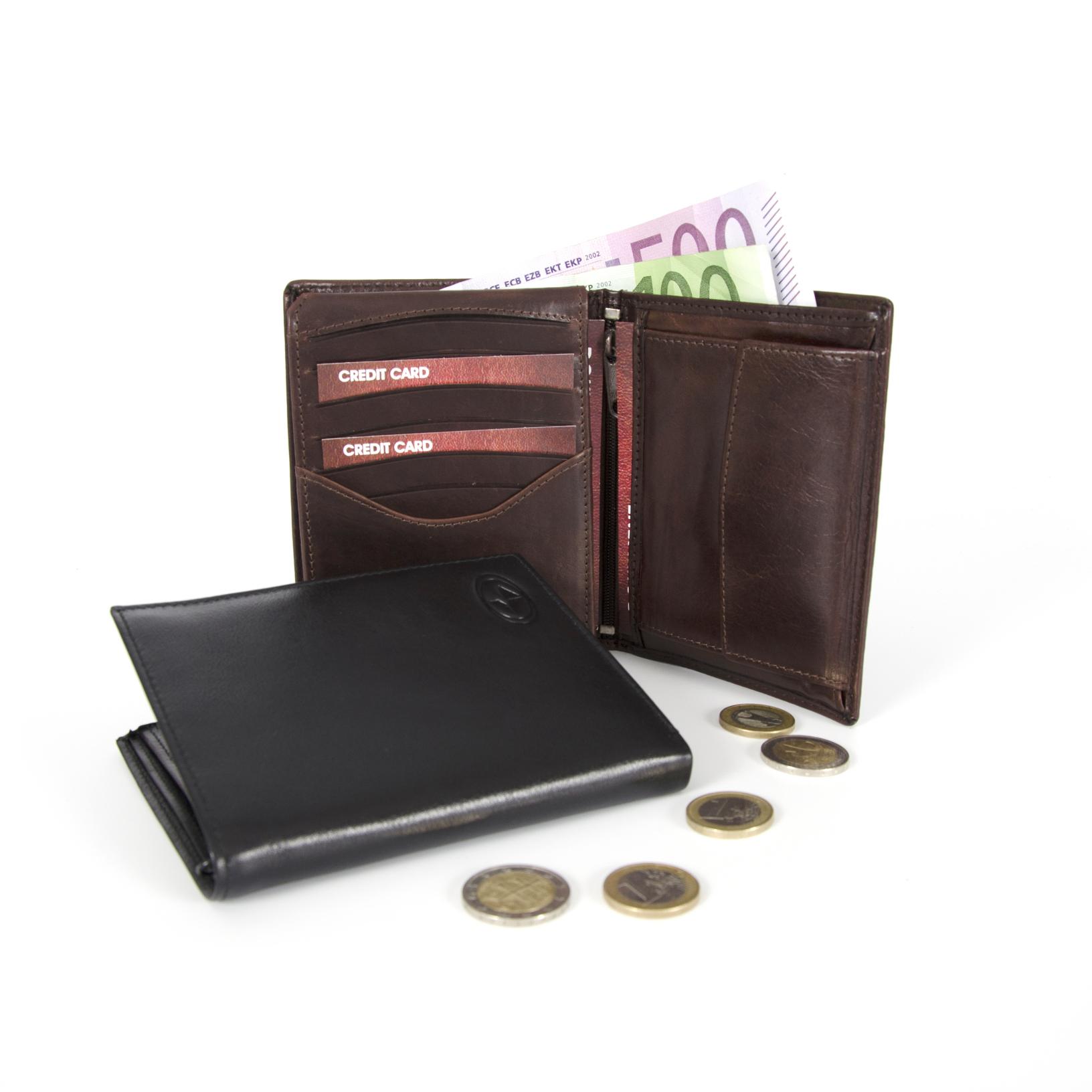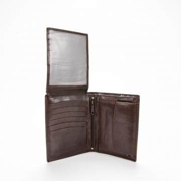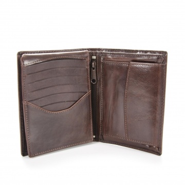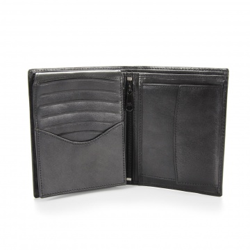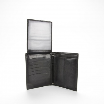 Velika moška listnica z dvema predaloma za denar, dvanajstimi predali za kartice, štirimi predali v velikosti dokumentov ter skrivno zadrgo. Preklopna prostorna denarnica ima klasičen predal za kovance.
