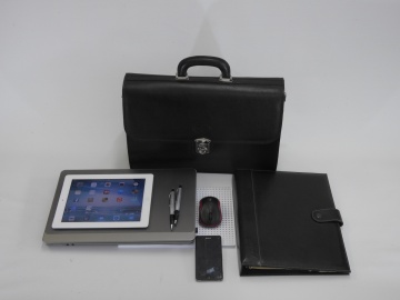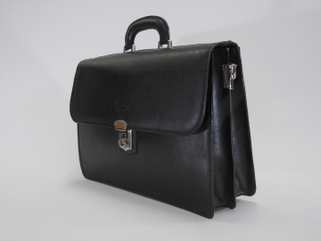 Poslovna aktovka.Notranjost - 2 lepo dodelana predala + sredinski predal z zadrgo, prostor za mobitel in kartice; Zunanjost - na hrbtni strani predal z zadrgo, pod pokrovom predal + pas za čez ramo.
