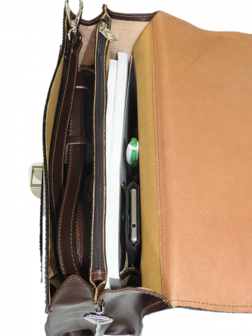 Elegantno-poslovna damska torba. Notranjost-2 lepo dodelana predala+sredinski predal z zadrgo, prostor za mobitel in kartice; Zunanjost- na hrbtni strani predal z zadrgo, pod pokrovom predalček+ pas za čez ramo.